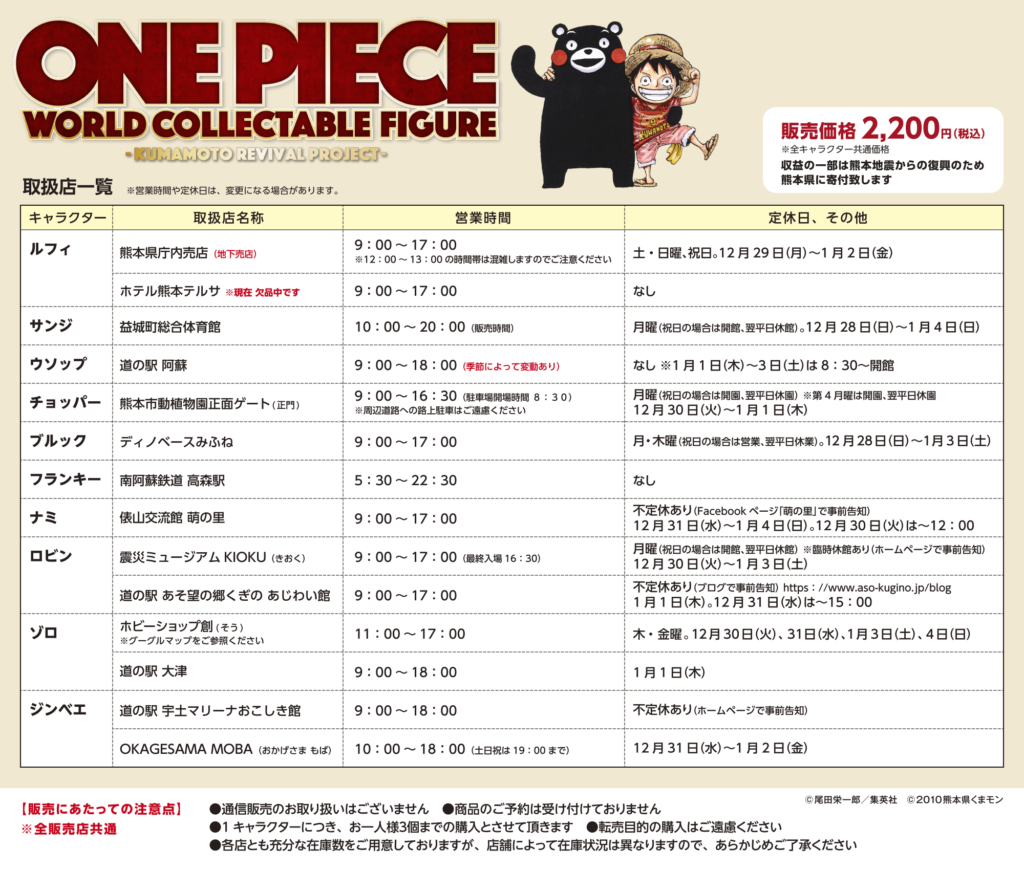 各フィギュアの販売状況です。品切れの店舗や再入荷の情報などは、こちらの熊本復興プロジェクト公式ホームページやTwitter(X)でお知らせしますのでご確認をお願いします。