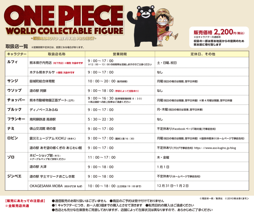 各フィギュアの販売状況です。品切れの店舗や再入荷の情報などは、こちらの熊本復興プロジェクト公式ホームページやTwitter(X)でお知らせしますのでご確認をお願いします。