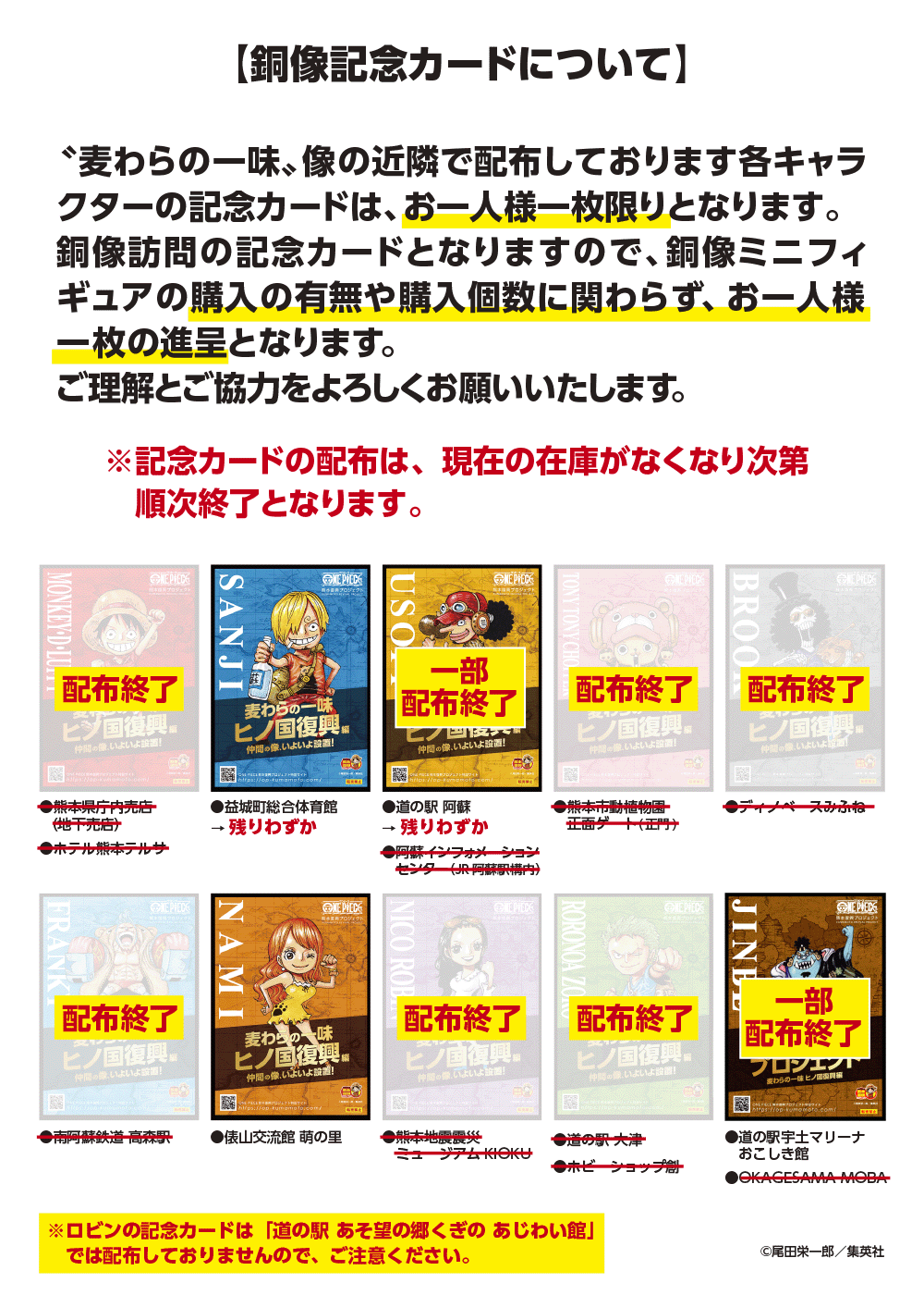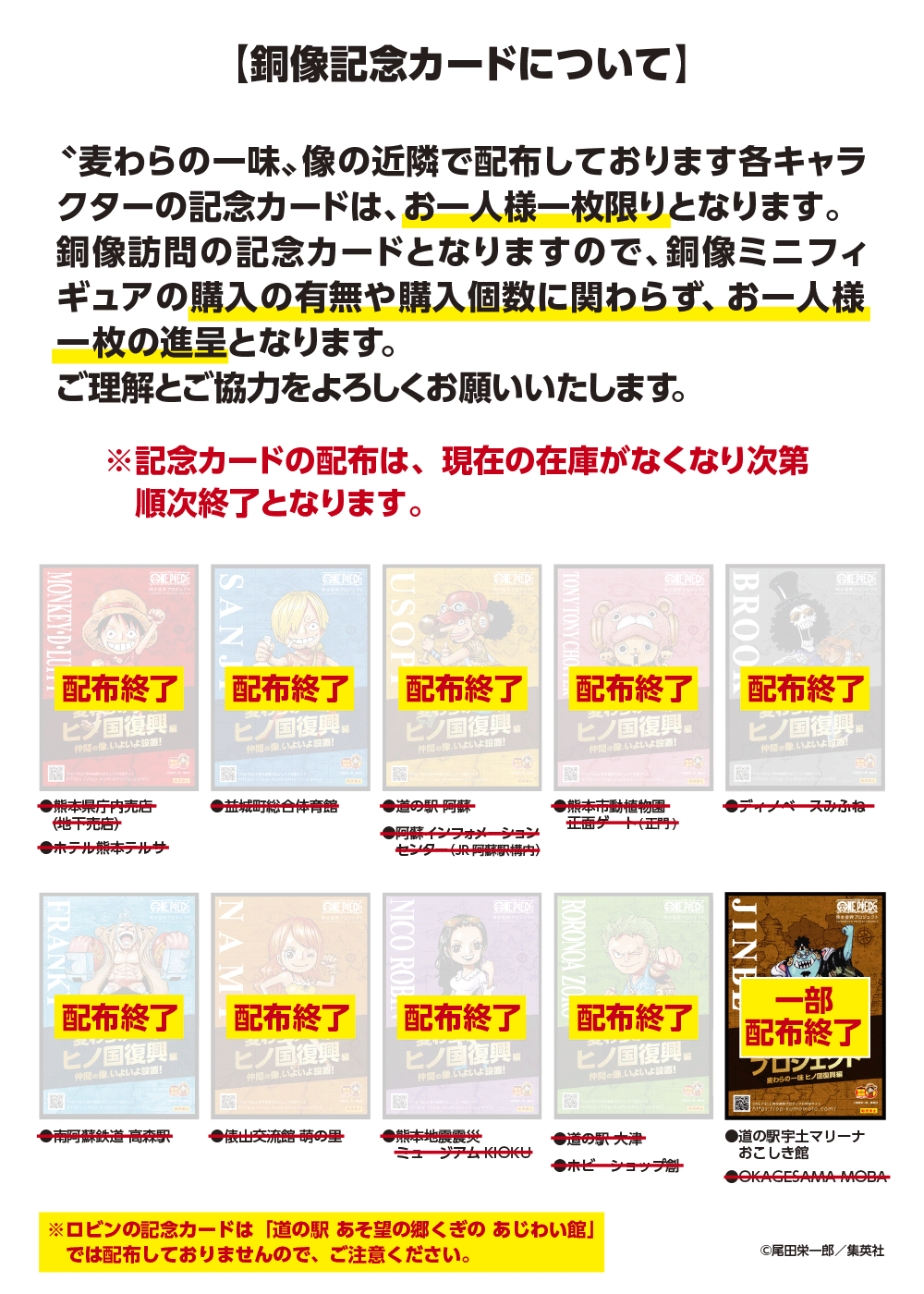 〝麦わらの一味〟像の近隣で配布しております記念カードは、お一人様一枚限りとなります。